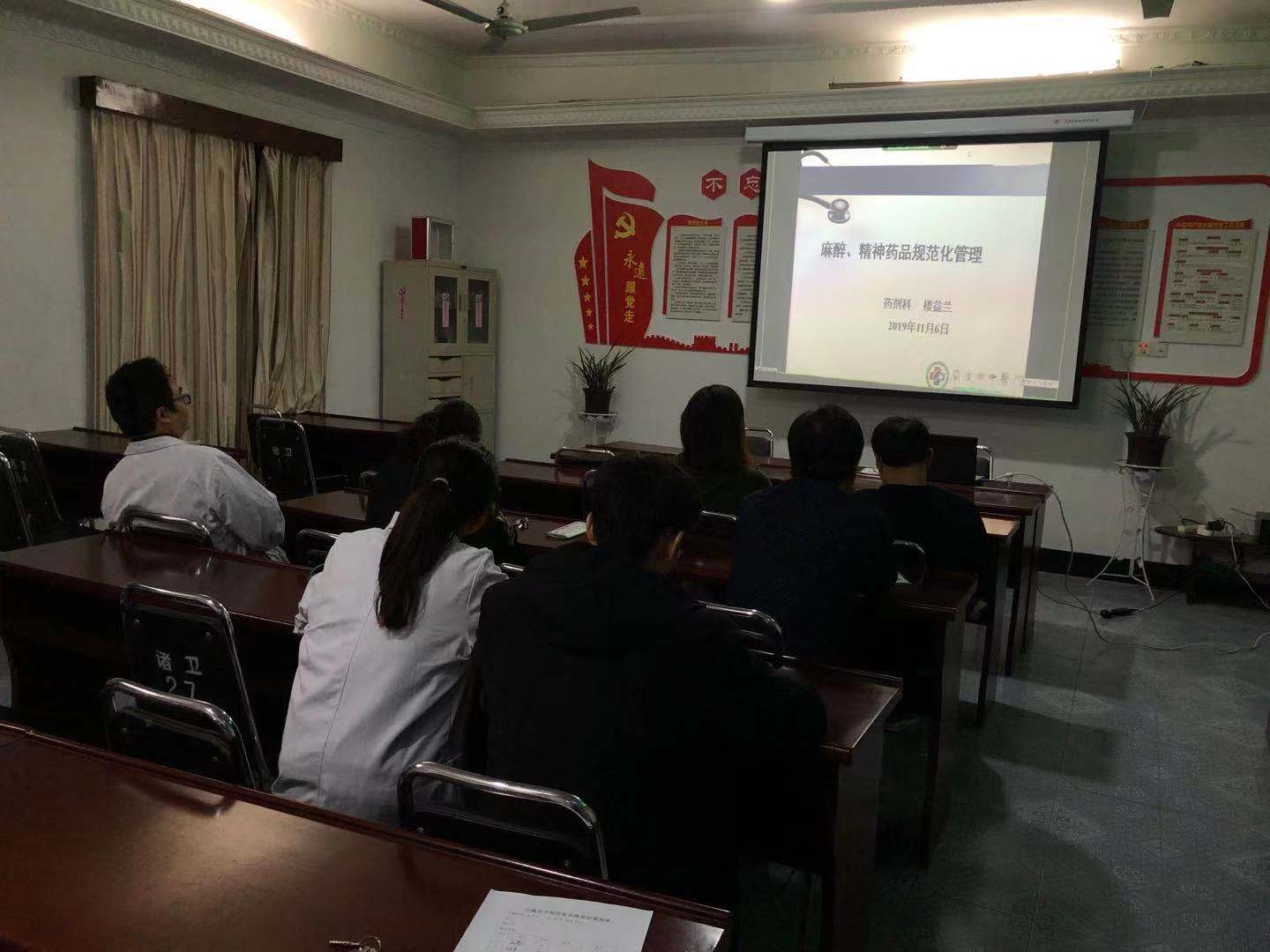 最后楼益兰主任从六个方面对麻、精药品的规范化管理进行培训,分别是机构和人员的规范化;培训的规范化;采购、验收、储存和保管的规范化;处方的规范化;调配和使用的规范化以及药品的安全管理。