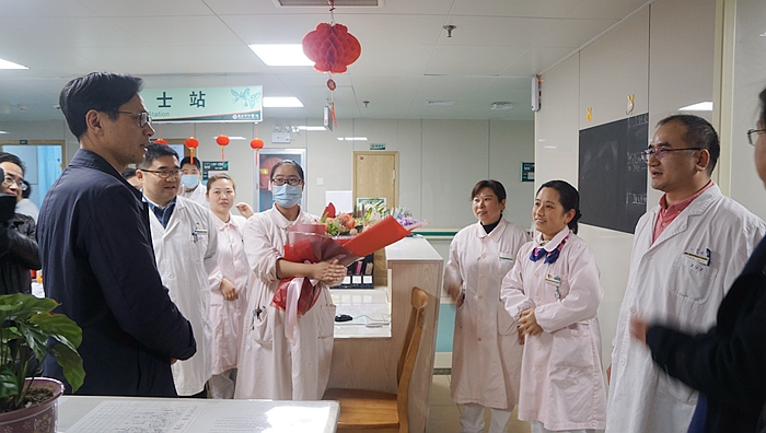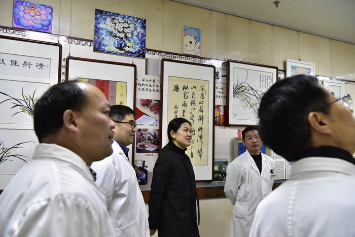 在孙院长的陪同下,市委书记朱瑞俊一行前往八病区,看望医务人员及住院者,与医务人员进行了亲切的交谈,送上鲜花和慰问金,并祝福大家“新年好!”对医务人员恪尽职守的敬业精神道一声“大家辛苦了!”。在途经病房大楼通廊时,看到了医院首届职工书画展,驻足观赏,赞不绝口。他说:“在百忙之中仍不忘提升文化修养,不仅放松了工作的压力,还增强了团队之间的凝聚力,一举双赢”。同时,对中医院近年来的快速发展、明显提升的中医药特色等各项举措表示肯定和赞赏。
